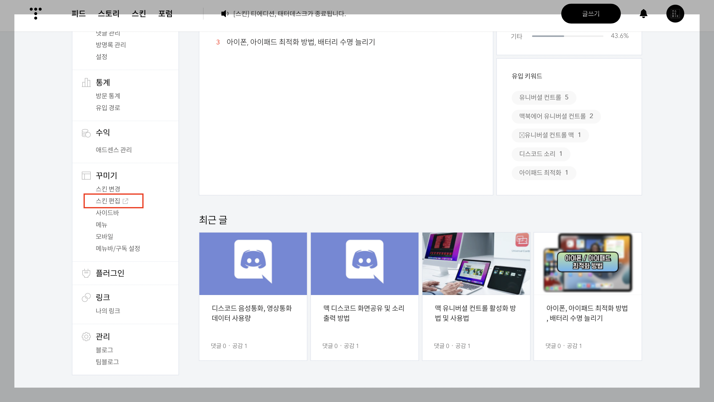 5. 자신의 티스토리 블로그를 관리자로 로그인을 한 후 설정에서 [꾸미기] - [스킨편집] 항목을 클릭합니다.