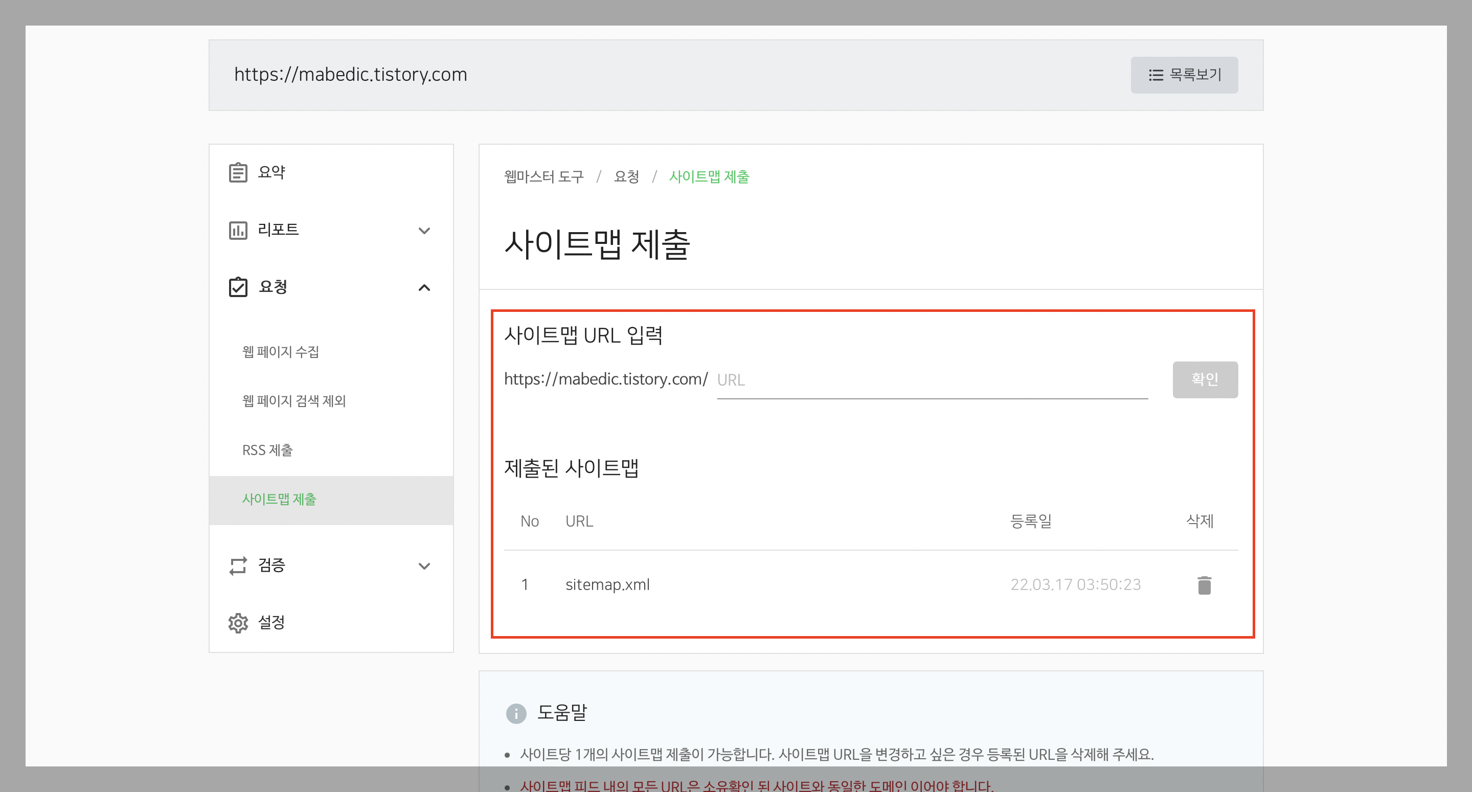 3. 마찬가지로 [ 요청 ] - [ 사이트맵 제출]에서 자신이 등록한 웹사이트 뒤에 sitemap.xml을 붙힌후 빈칸에 등록합니다.