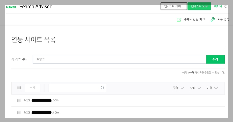 3. 연동 사이트 목록에 들어오면 사이트 URL에 자신이 등록하고자 하는 사이트를 추가합니다.