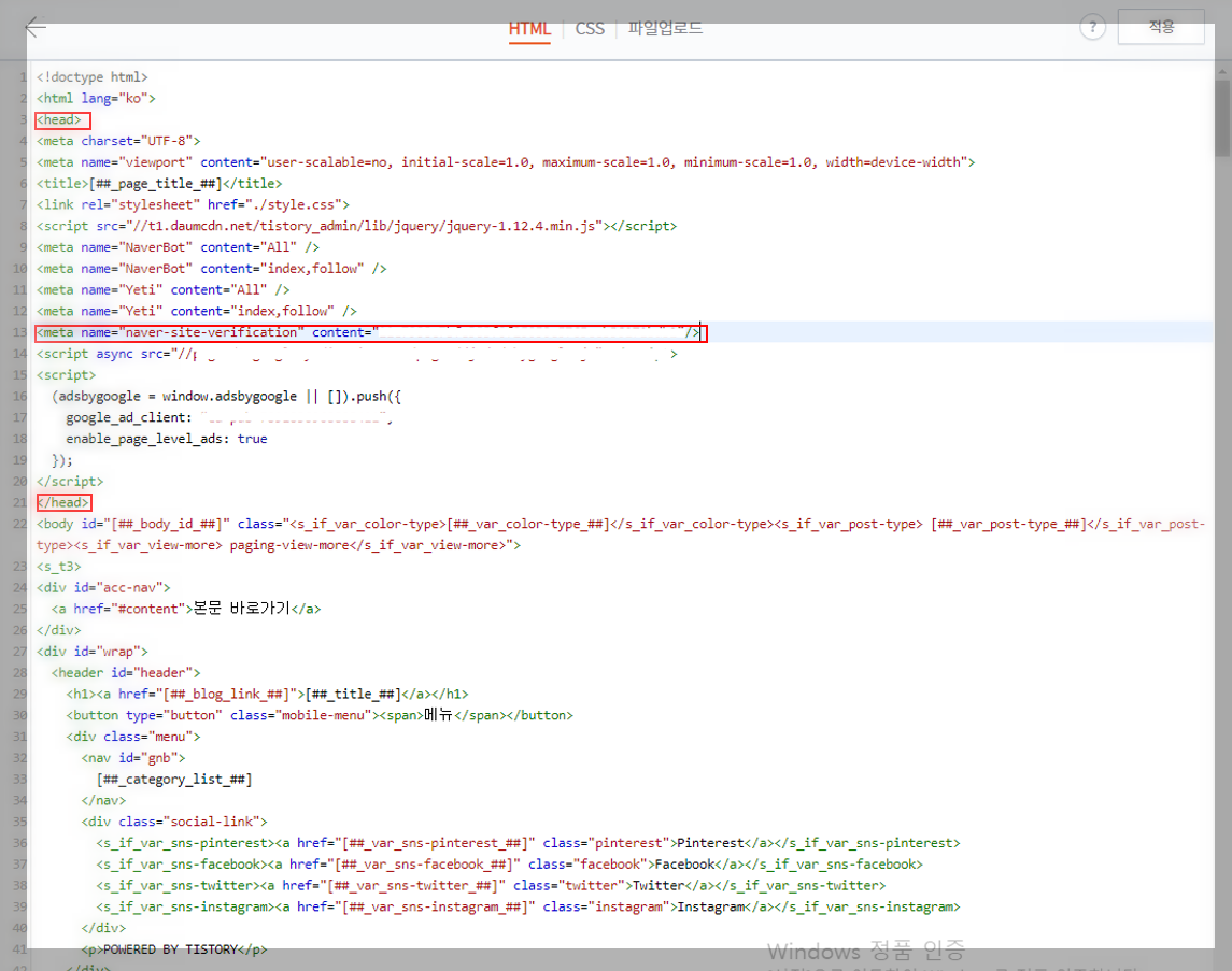 7. 위에서 복사한 메타코드를 <head>, </head> 사이에 붙여넣습니다. ( CTRL + V )