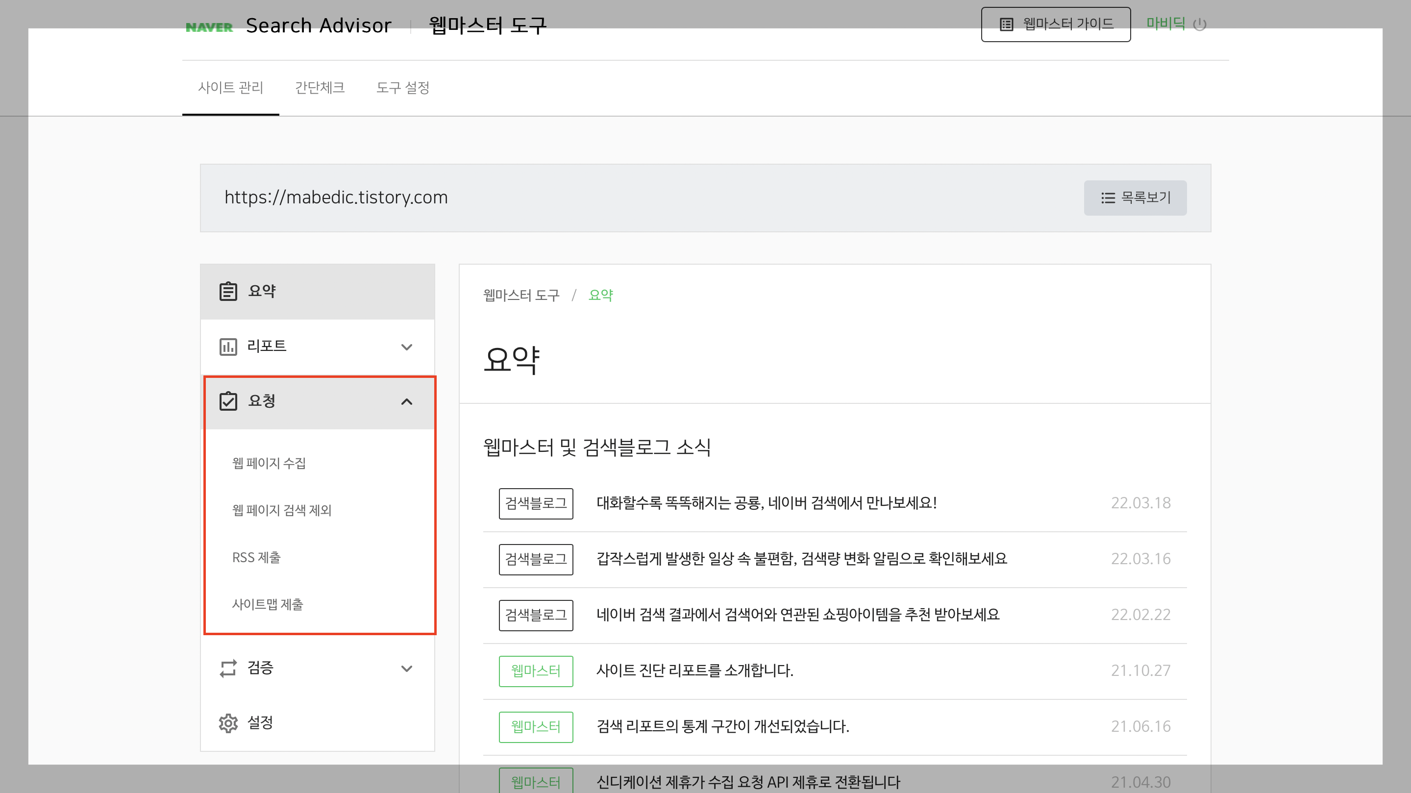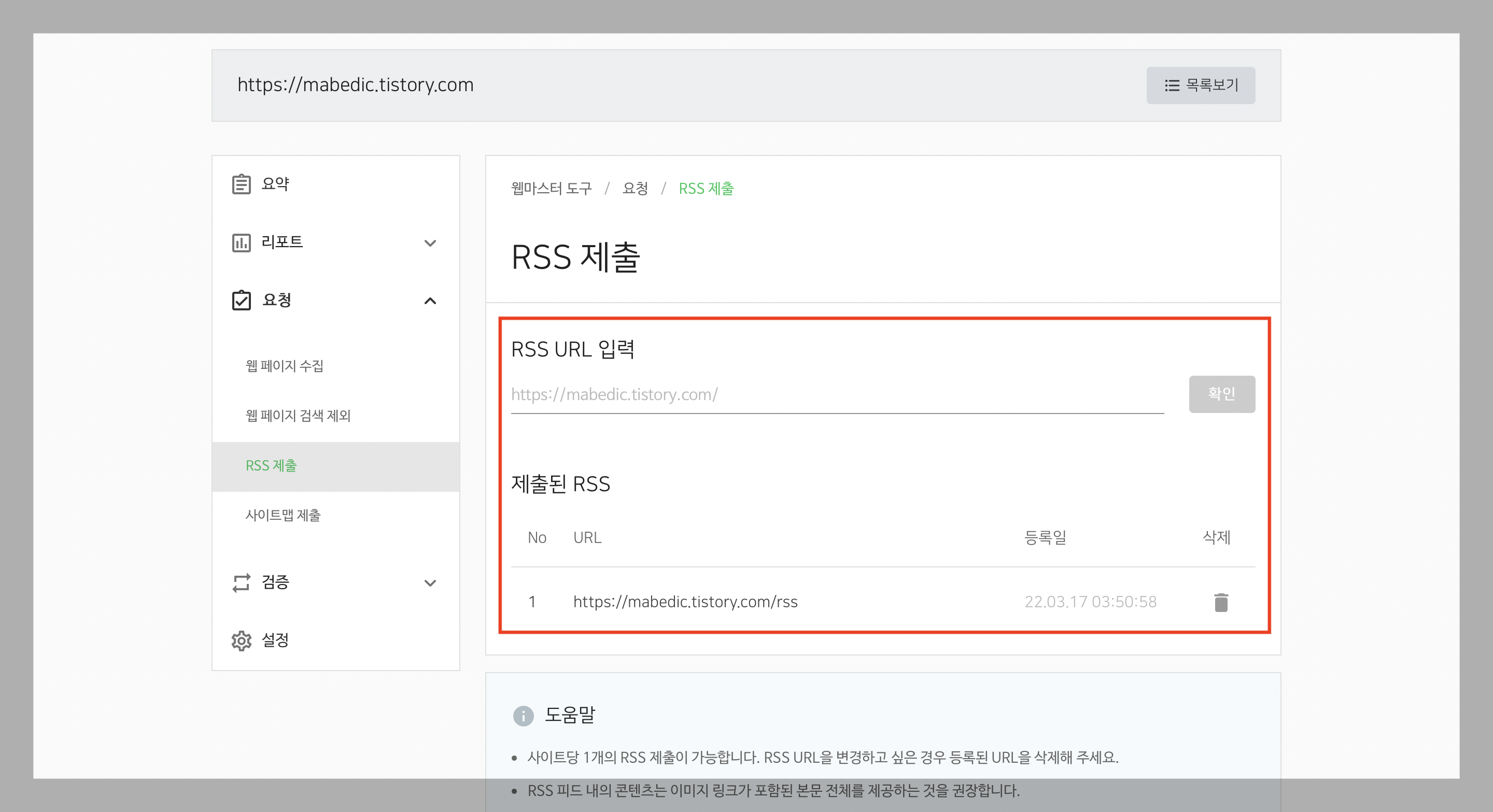 1. 자신의 사이트 주소를 사이트 목록에서 클릭 한 후 [ 요청 ] - [ RSS 제출 ]을 클릭합니다.